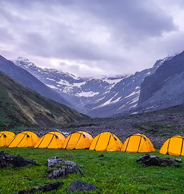 Get up early to catch the view of golden rays of sun falling on the grass in the meadow. Enjoy the view with a hot cup of tea. Today's trail majorly constitutes of forests, meadows & gushing streams of water. We walk through the meadows towards the Gunas Pass. After we cross a steam, the view of the Dhauladhar range is captivating. A few minutes after we enter the forest of Bhoj trees (Silver Birch). After a while, we come across another stream. Cross it & get your first view of Litham. We would walk in a gorgeous meadow again. Across the meadow, we cross the Chandranahan Stream and arrive at our campsite for the day. Litham is a beautiful campsite. Notice the Chandranahan waterfalls beyond which lies the famous Chandranahan Lake. Buran Ghati lies behind the mountain in front of us. Get ready for a great adventure starting tomorrow.